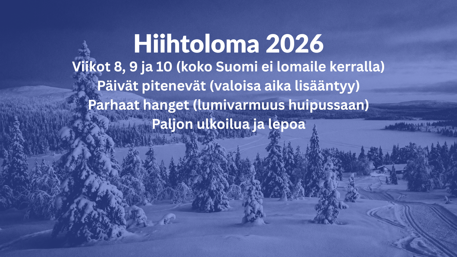 Olipa suunnitelmissasi vauhdikas aktiiviloma tai täydellinen irtiotto arjesta, tärkeintä on nauttia talvesta ja yhdessäolosta. Hyvää hiihtolomaa 2026!